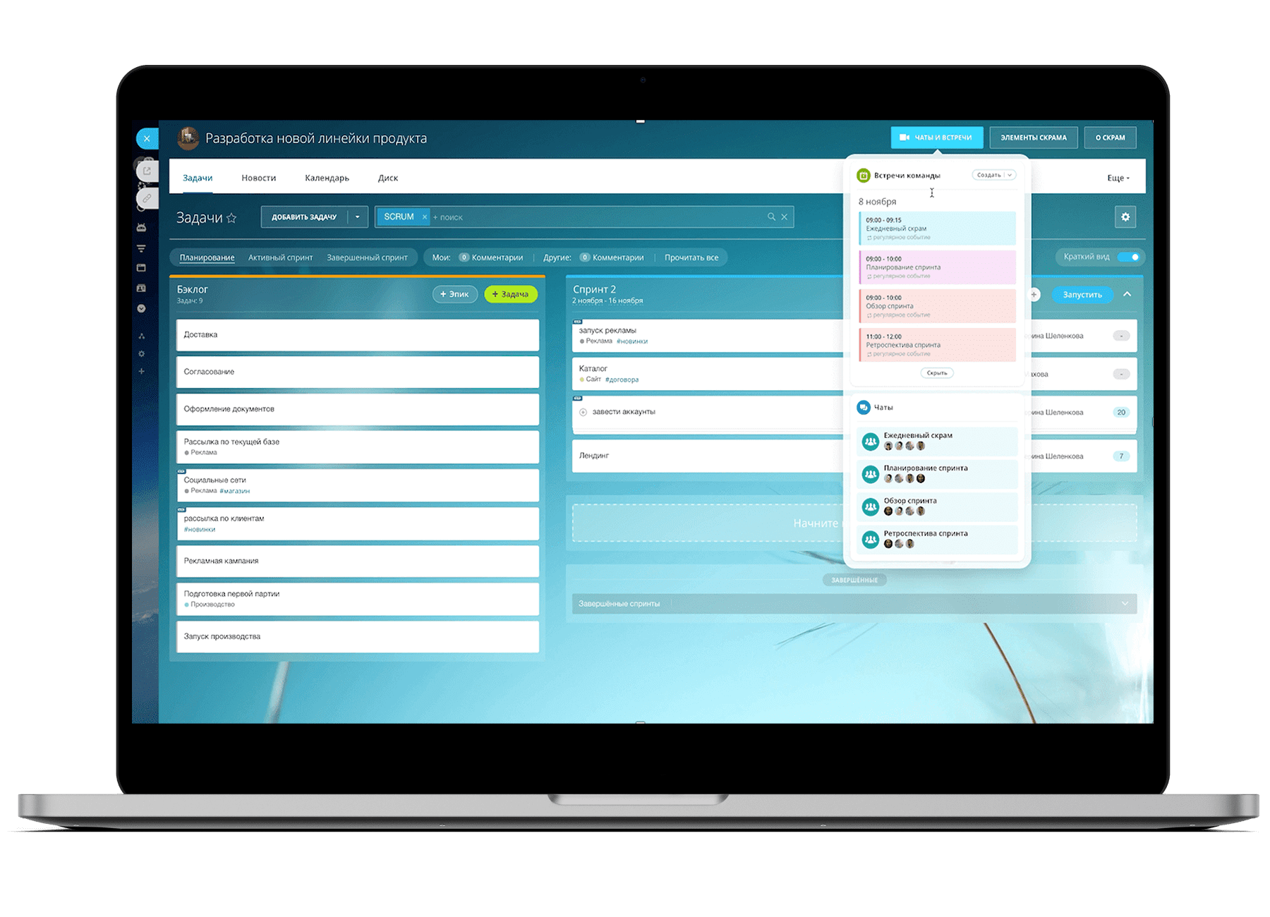 Выстраивайте работу над проектом по любой удобной вам методике: канбан-доска, сортировка по датам или горящим срокам, диаграмма Ганта, Скрам.