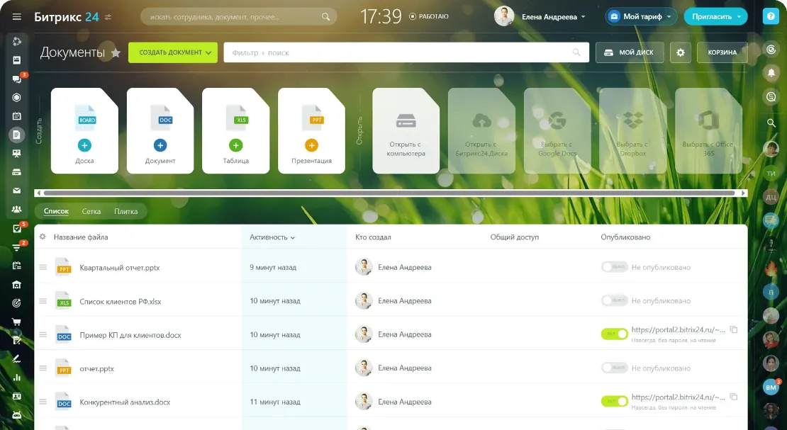 Все файлы, с которыми вы работаете, собираются в отдельном разделе в вашем Битрикс24 и удобно сортируются.